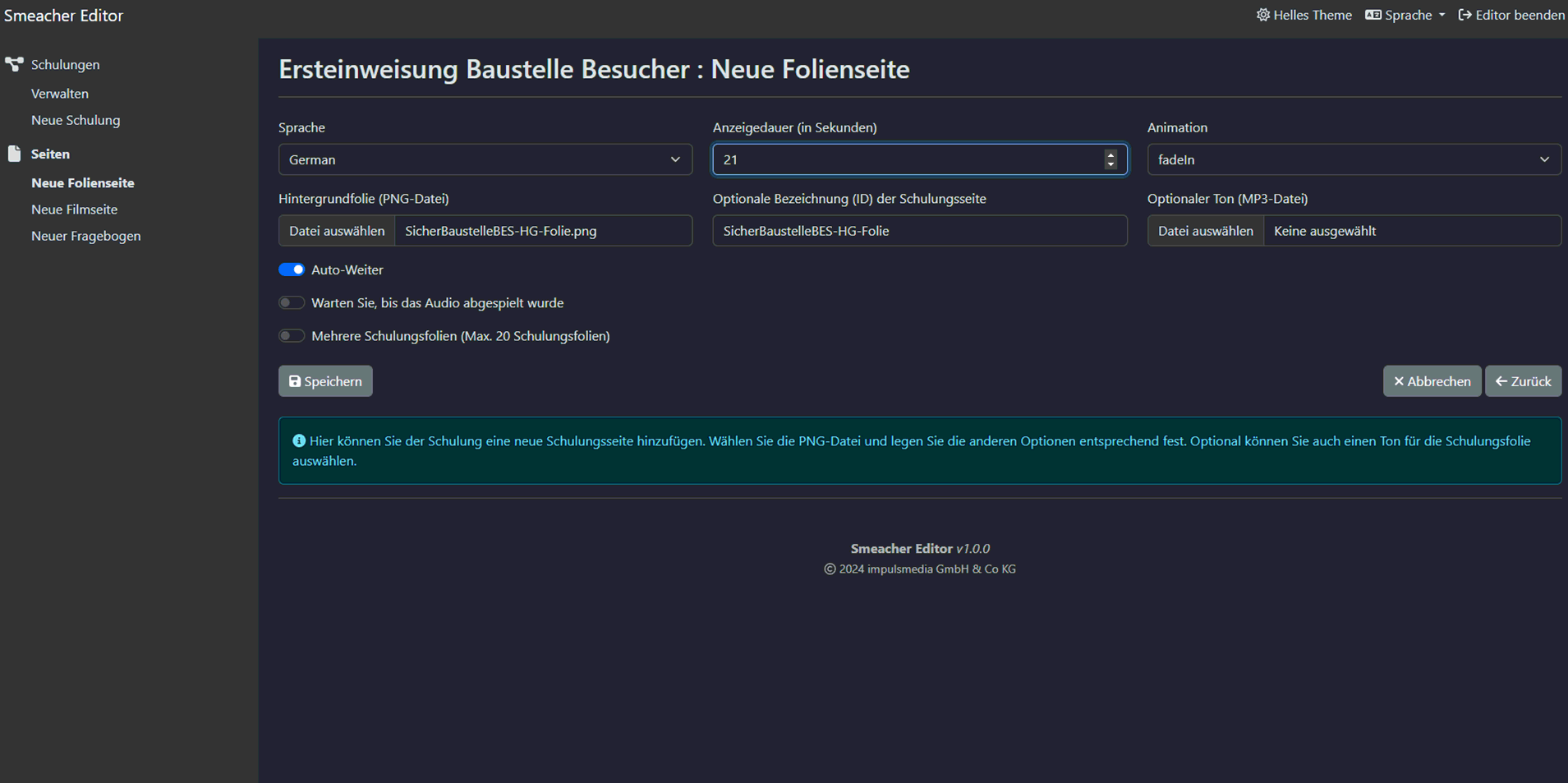 Mit dem intuitiv bedienbaren Smeacher-Editor stellen Sie aus vorhandenen PowerPoint-Folien oder Videos, in kürzester Zeit eigene Schulungsinhalte zu ein- oder mehrsprachigen Kursen zusammen. Analog zum Kurs, können Sie die Prüfungsfragen für den Test anlegen; diese natürlich bei Bedarf ebenfalls in mehreren Sprachen. Ein KI-Assistent ist eine optionale Erweiterung und unterstützt Sie bei der Erstellung Ihrer Inhalte.